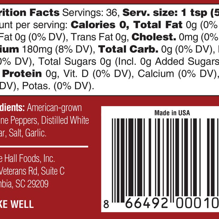 pantryThe company's flagship sauce. Made from American-grown red cayenne peppers hand-picked at exactly that right time, and then salted down and aged until the mash is perfect for conversion and bottling. An all-natural product that is 86% cayenne peppers, this sauce packs a truly authentic, aged cayenne flavor that will be very different when compared to other sauces that typically have more vinegar. Depending upon each growing season's weather patterns, heat (1-10) will range between 5-6.