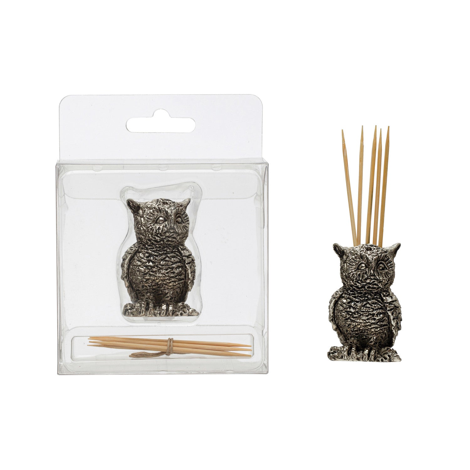 Pewter Owl Toothpick Holder w/ 6 Toothpicks